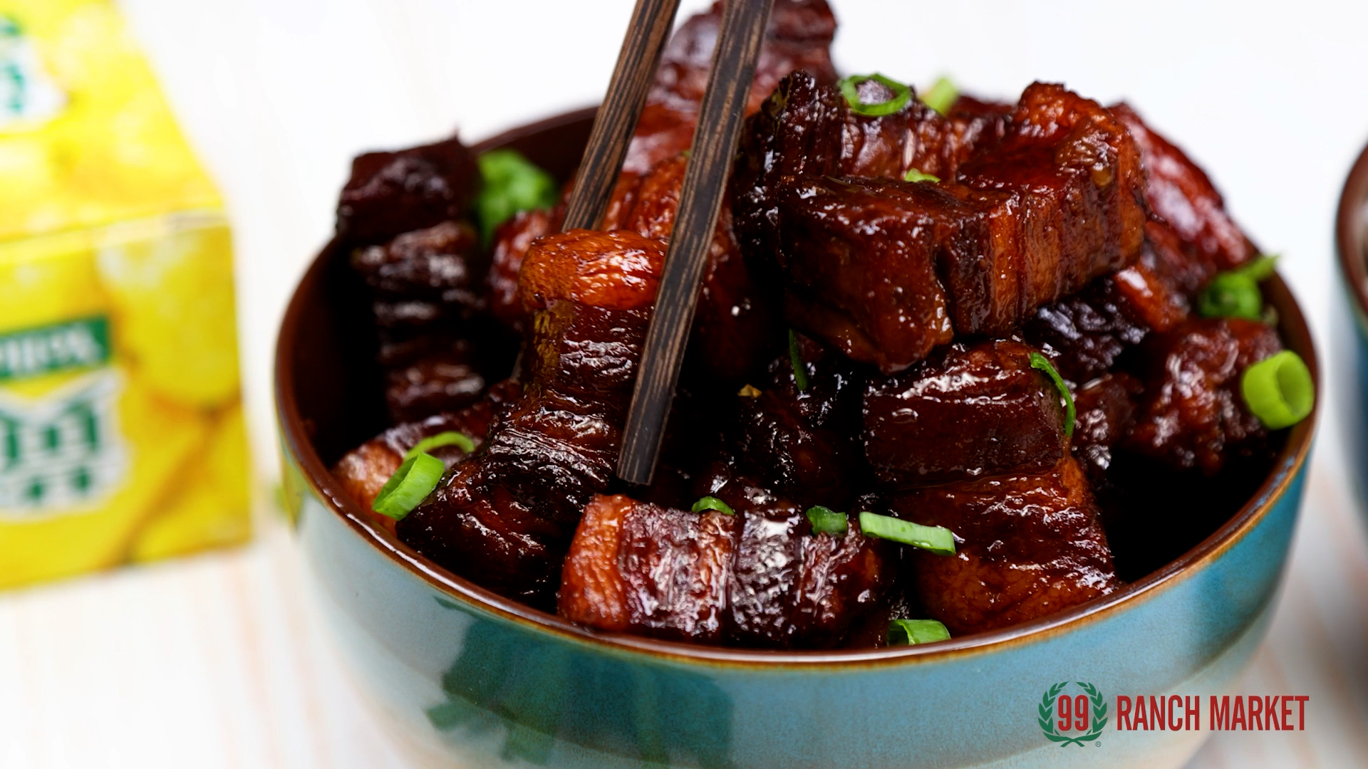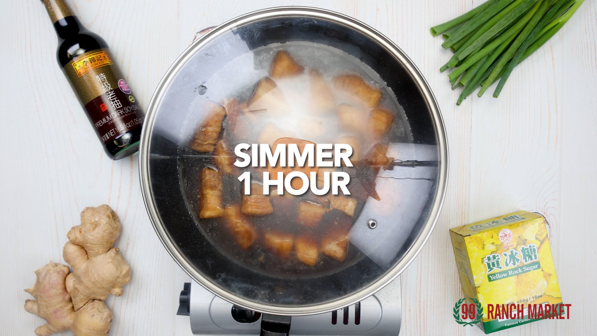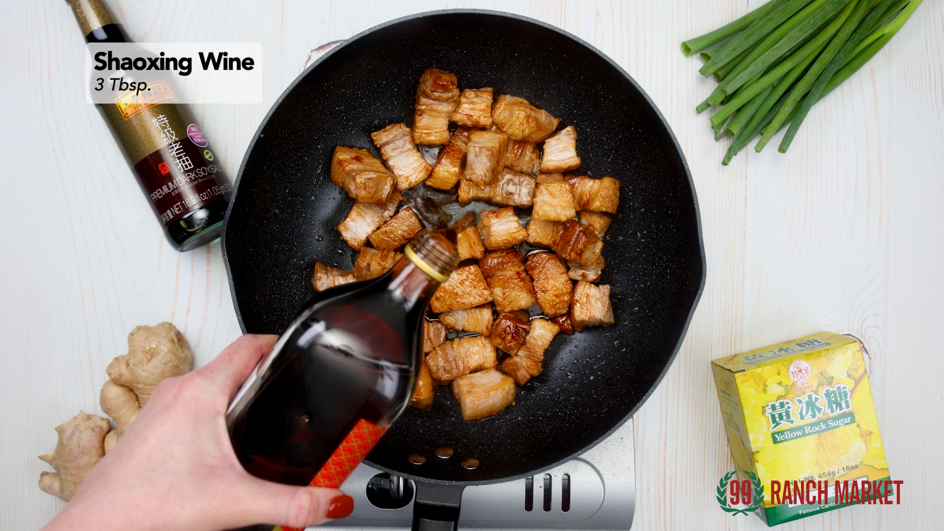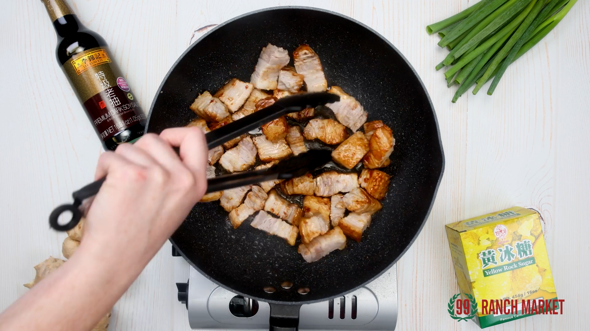 In a wok, with medium high heat, add in Vegeable Oil, Rock Sugar, and Pork Belly. Cook Until the pork belly turn brown.