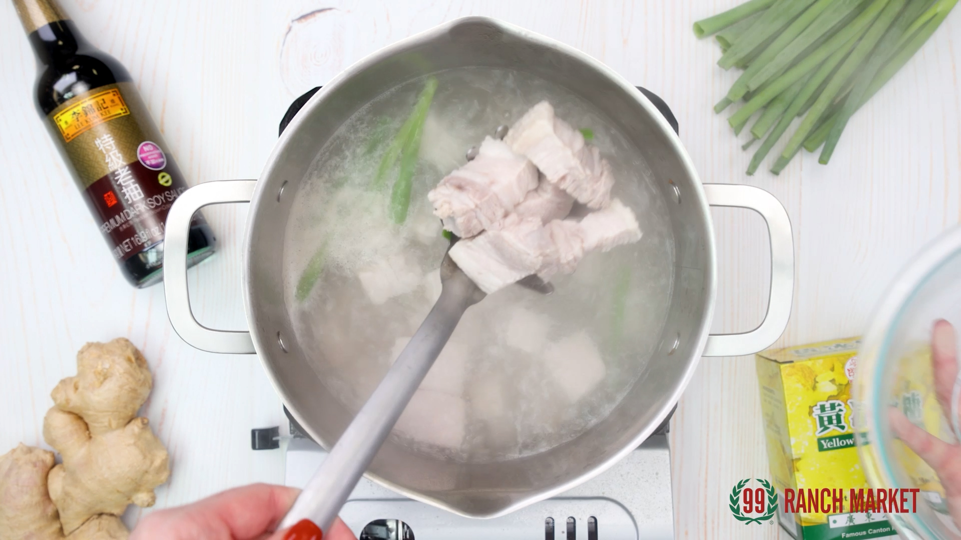 Cut pork belly into desired size. Bring water to boil and add in few slices of ginger, few stems of green onion, and pork belly. Cook the pork belly until it turn white on the surface and take it out of the pot.