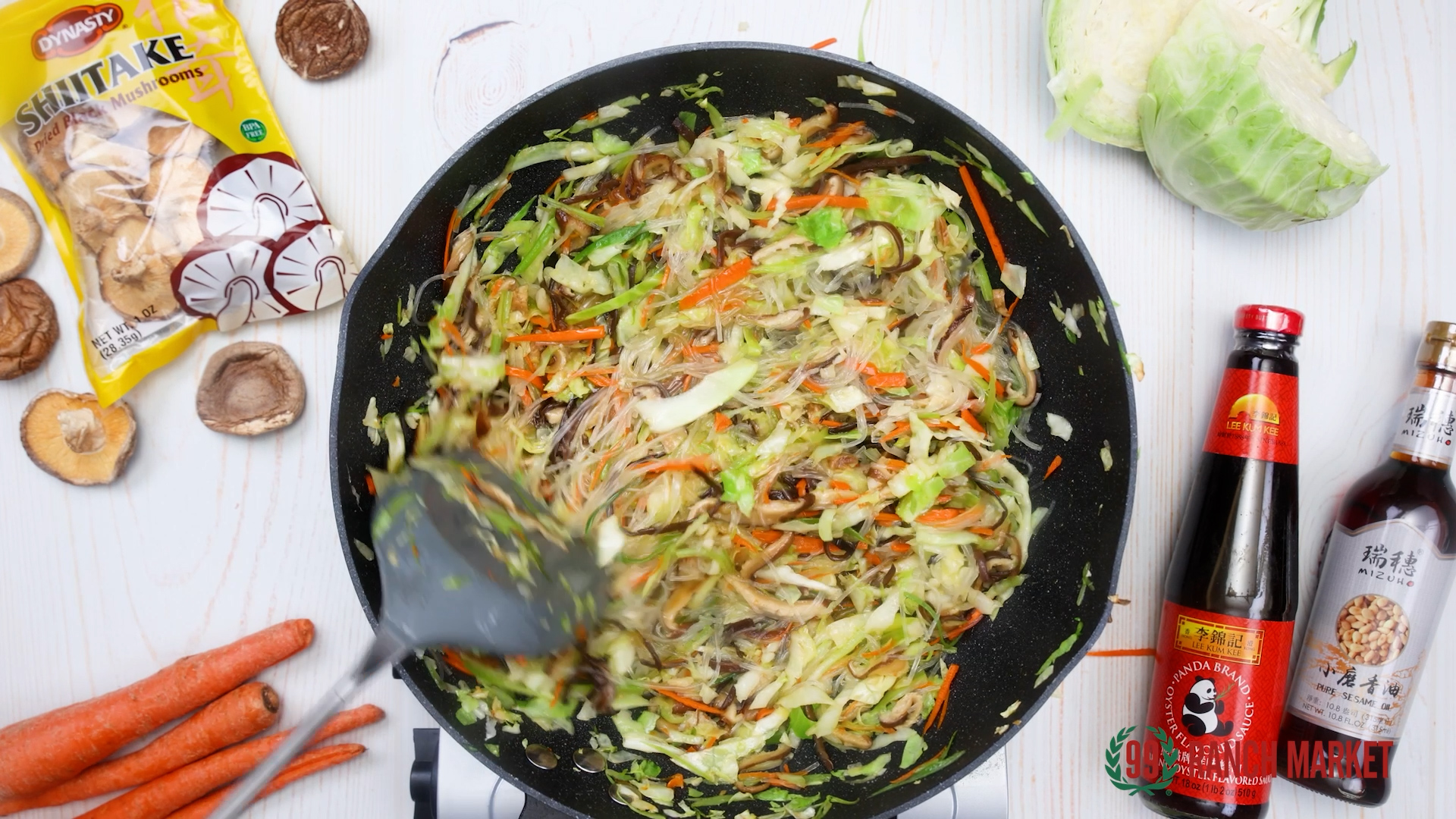 In a pan with medium high heat, add in oil, garlic, shitake mushroom, celebry, cabbage, carrot, green onion, cloud ear fungus mushroom, salt, sugar, vegetarian oyster sauce, vermicelli noodles, and sesame oil. Stir fry untl the ingredients become soft and set it aside