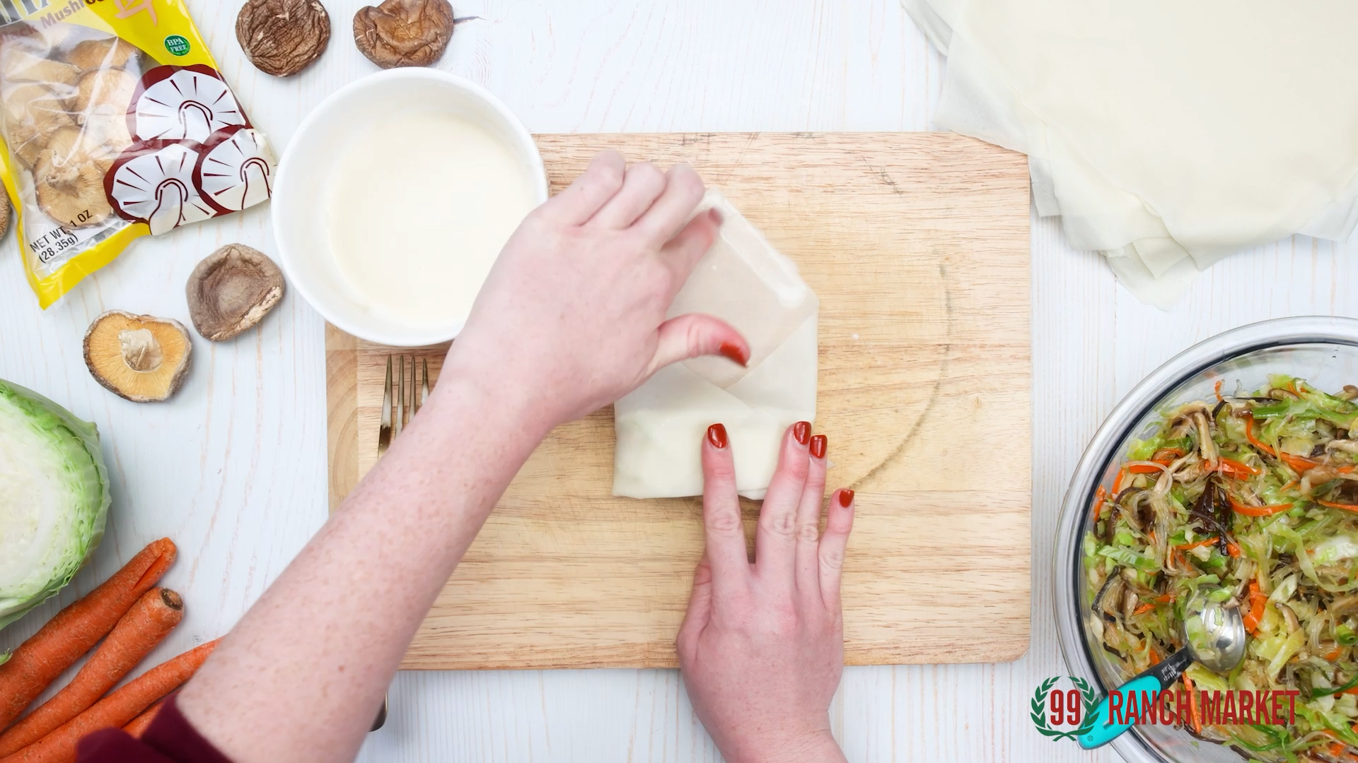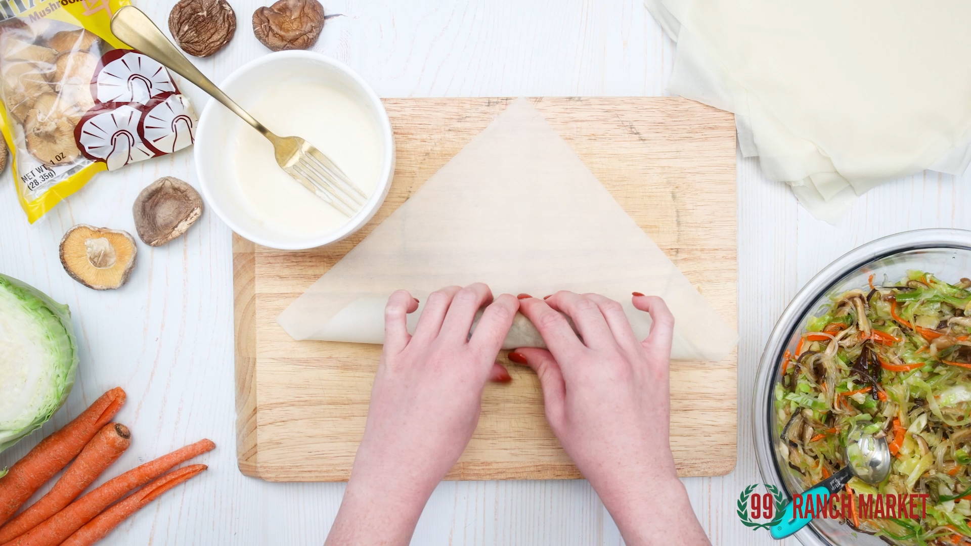 Take a egg roll wrapper, place proper amount of the vegetable mixture as the filling, roll upwards, fold the two sides and seal the wrapper with 1:1 water/ flour mixture
